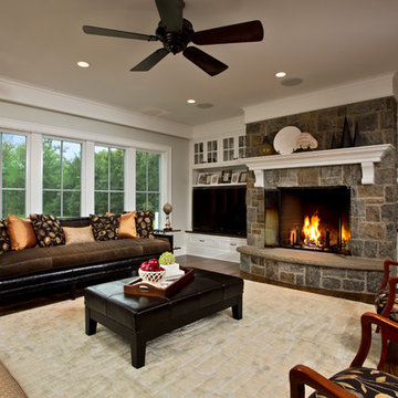 Inspiration for a large farmhouse open concept medium tone wood floor living room remodel in Boston with gray walls, a standard fireplace, a stone fireplace and a wall-mounted tv